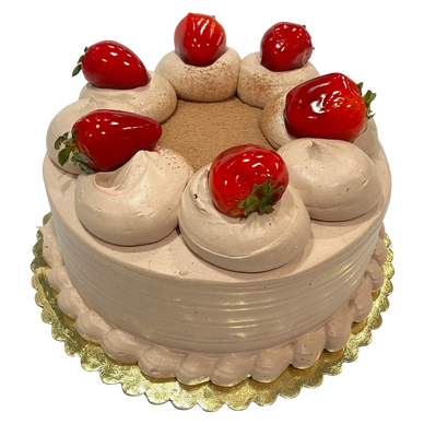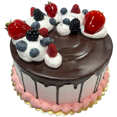 Chocolate and vanilla tres leches cake layers. Strawberry buttercream filling. Topped with chocolate ganache, buttercream, and berries.