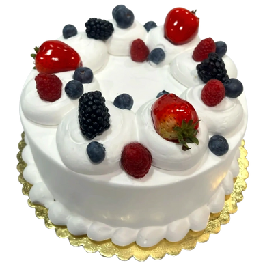 Vanilla cake with tres leches. Strawberry buttercream layers with light buttercream frosting. Topped with fluffy dream pillows and fresh fruit.