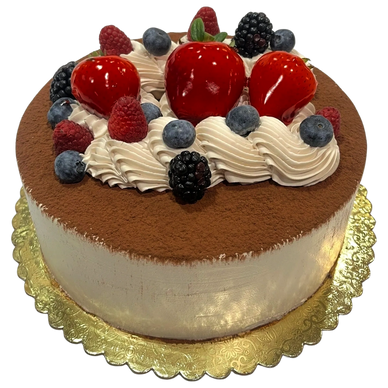 Chocolate cake with tres leches layers, and mocha filling. Lightly frosted with mocha buttercream. Cocoa powder drizzle, with fresh fruit.
